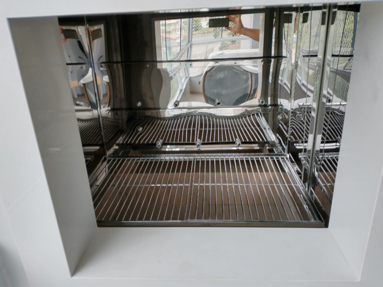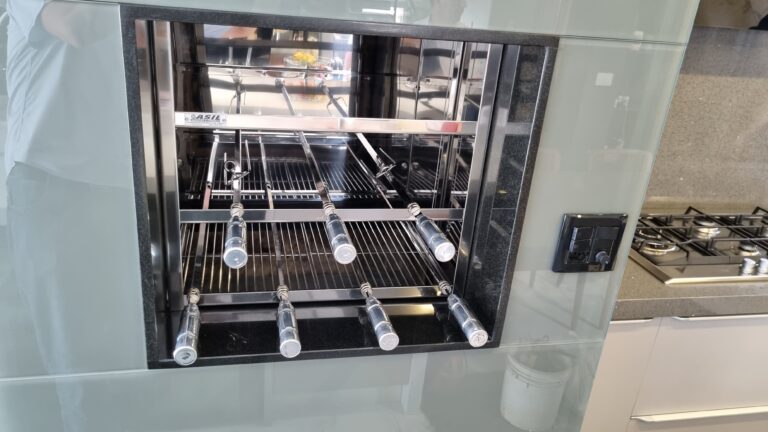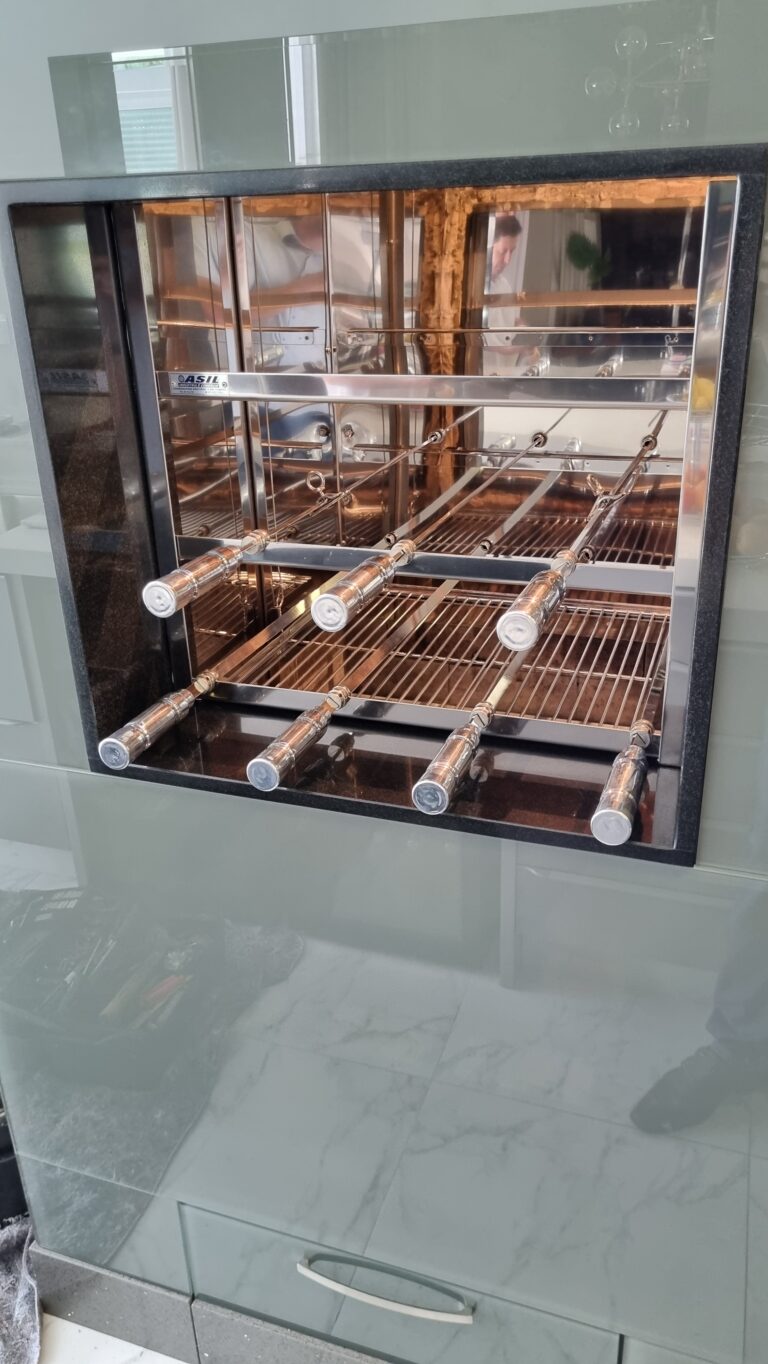 Modelo Amparo com apoio frontal para os espetos rotativos e grelha de inox com regulagem de altura motorizada