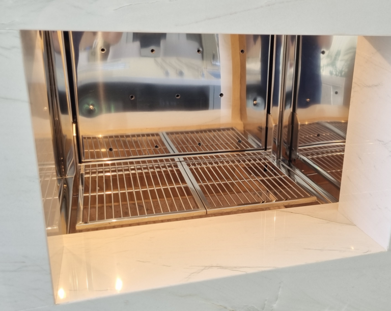 Neste modelo Levitá, os espetos ficam flutuantes, sem apoio na boca da churrasqueira, assim como a grelha que fica apoiada apenas no fundo da churrasqueira, não possuindo cabos de aço para sua suspensão.