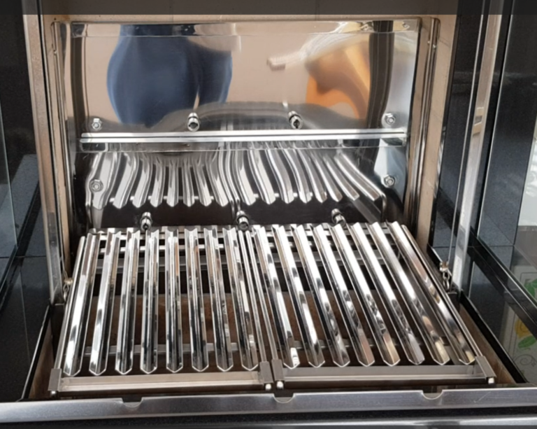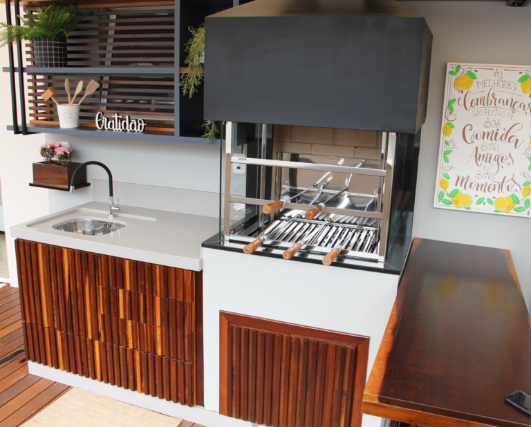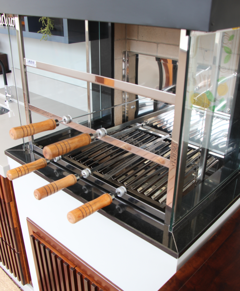 Modelo com grelha Parrilla, que é composta por barras em formado de “v” e inclinada com uma calha para coleta do “suco” da carne. Equipada com 5 espetos rotativos e grelha com regulagem de altura motorizada, fabricada em aço Inox sob medida.